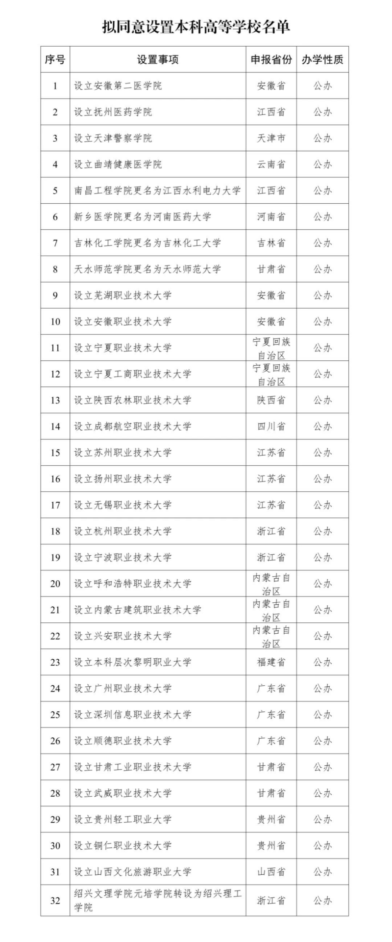 根据《中华人民共和国高等教育法》《普通高等学校设置暂行条例》《普通本科学校设置暂行规定》《本科层次职业学校设置标准(试行)》等有关规定以及第八届全国高等学校设置评议委员会考察评议结果,经教育部党组会议审议,拟同意设置安徽第二医学院等32所学校,现予公示。
